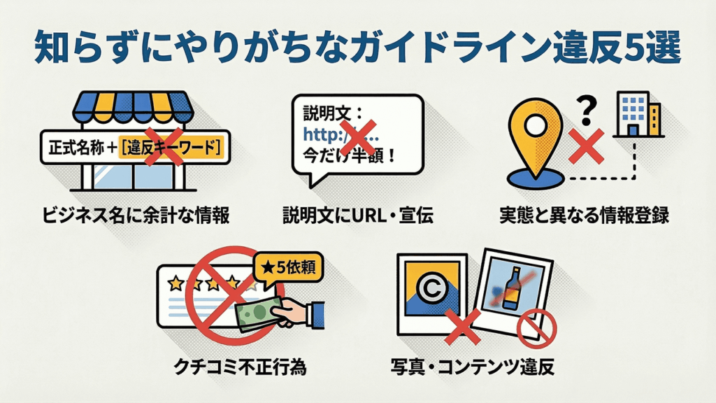 GBPのガイドラインは項目数が多く、すべてを把握して運用している事業者は多くありません。ここでは、中小企業や店舗オーナーが特にやってしまいがちな違反パターンを5つご紹介します。