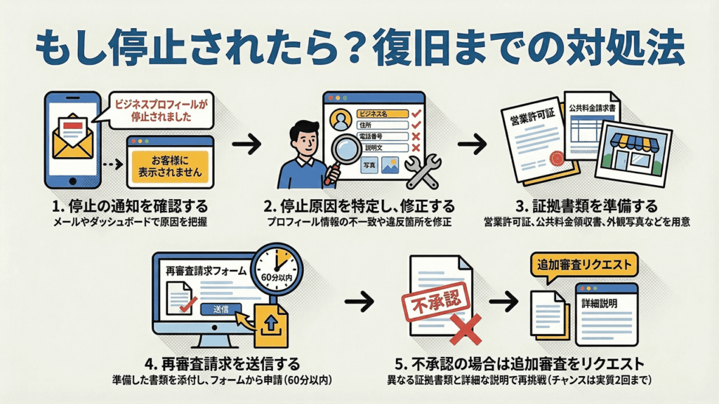 - 停止されるとGoogle検索・マップに表示されなくなる。2024年以降は審査が厳格化している