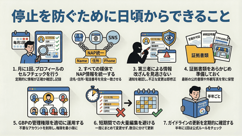 ガイドライン違反を避けるだけでなく、停止リスクを最小限に抑えるには日頃の運用体制がものを言います。ここでは、すぐに取り入れられる実践的な予防策を7つ、紹介します。