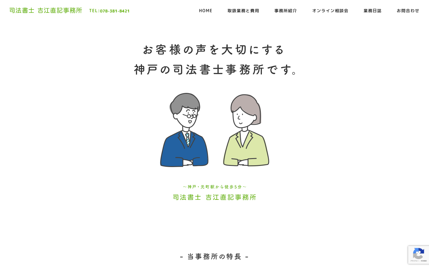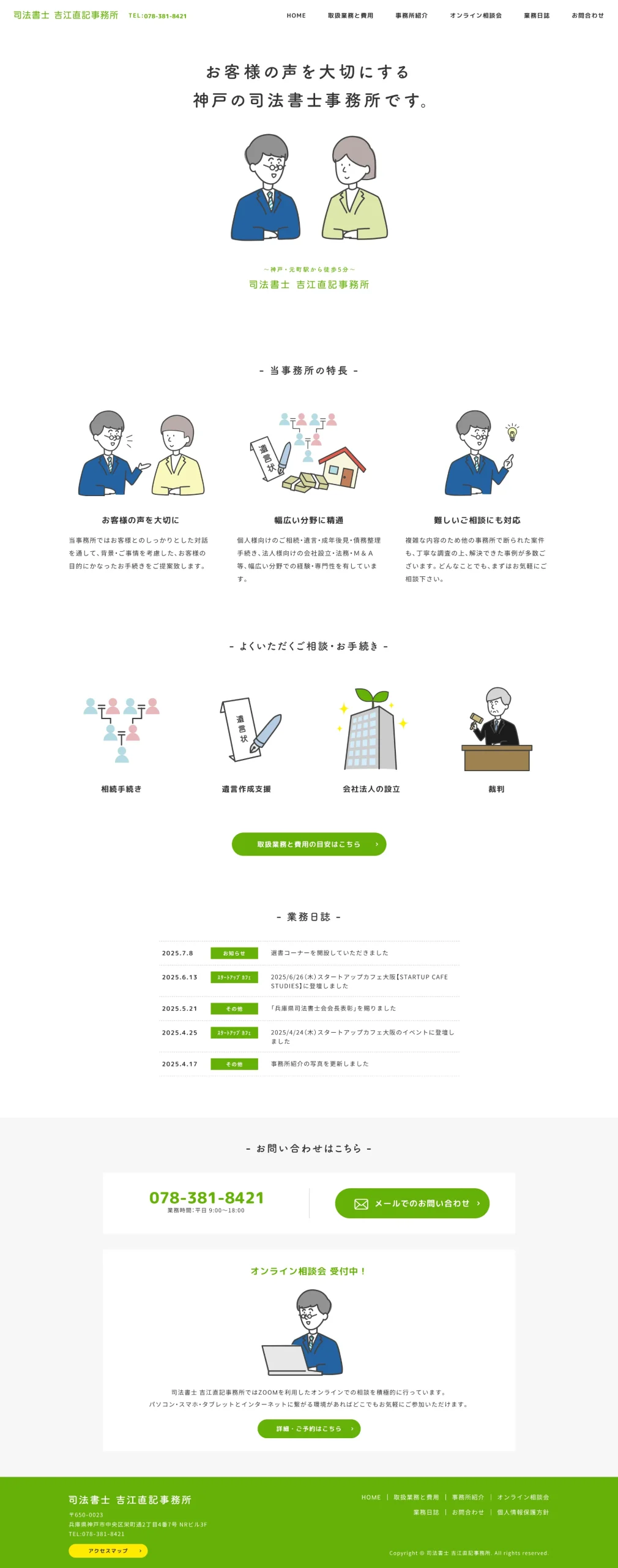 神戸市元町の司法書士事務所のコーポレートサイト。人柄の伝わるやさしいデザインとイラストで安心感を演出。