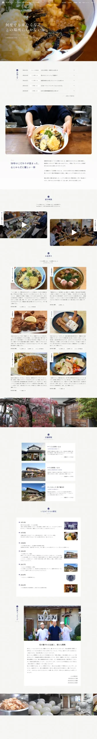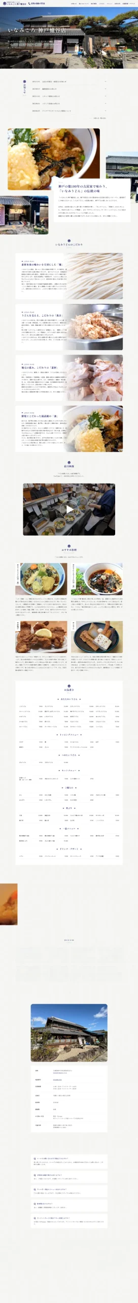 1974年に稲美町で創業した「いなみうどん」は、無添加食材にこだわり、「0歳から食べられるうどん」として地元で親しまれてきた老舗。現在は稲美町を中心に兵庫県で3店舗を展開しています。年間8万食以上を提供する名物「天ころうどん」をはじめ、その味を求めて連日遠方からも多くの人が訪れます。今回の制作では、3代にわたり受け継がれる想いと50年の歴史、そして職人のこだわりをしっかりと伝えることを目指し、実店舗での取材を重ねながらサイトを形にしました。