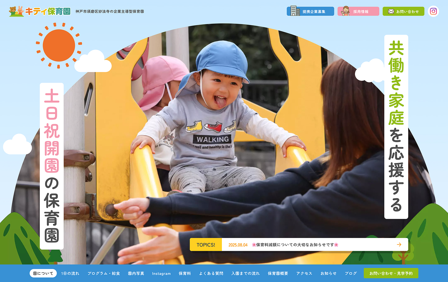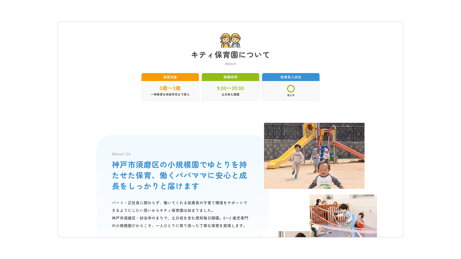 神戸市須磨区の企業主導型保育園「キティ保育園」のサイトをリニューアルしました。定員16名の小規模園で、土日祝も開園。感覚統合遊びや自然派食材の給食の採用など、充実した保育で共働き家庭を支えています。