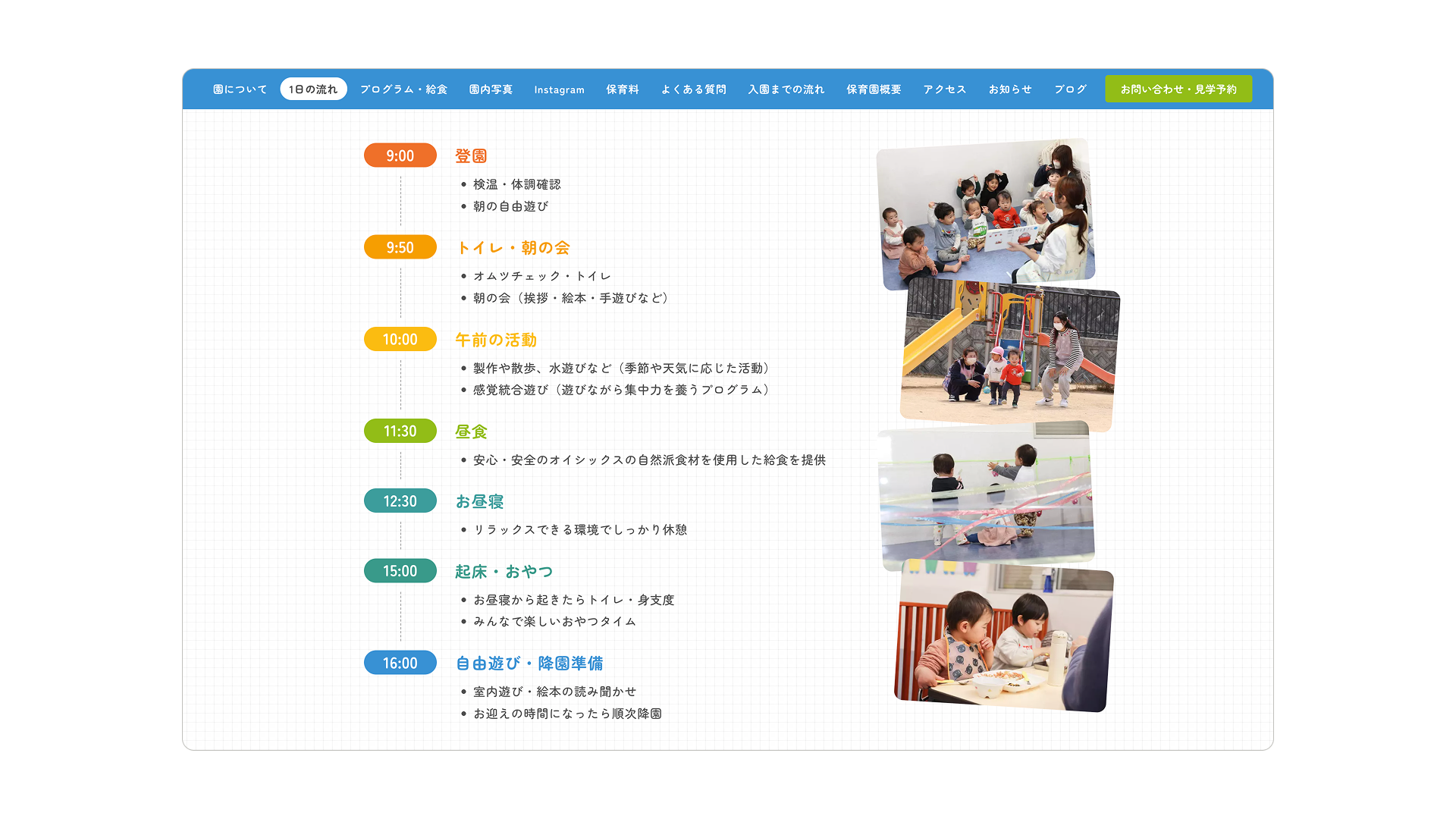 サイトの制作にあたって、現地取材・撮影に同行し、実際の保育現場で感じた温かさをデザインとコピーに反映しました。またWordpress(更新システム)を導入し、採用情報や保育受入状況など定期的な更新が必要な箇所をお客様で簡単に更新できるようにすることで、園側で手軽に更新でき、いつでも最新情報を届けられる仕組みを整えました。