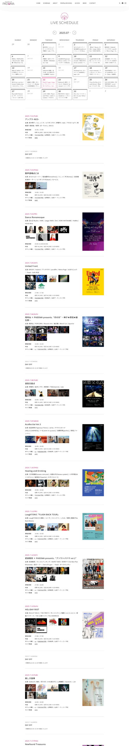 ライブハウスのサイトには、「来場者」「出演希望者」「主催者」など、さまざまな目的を持つ訪問者が集まります。それぞれが必要な情報に迷わずアクセスできるよう、目的別にメニューを整理し、導線を明確に設計する必要がありました。イベント情報は視認性の高いカレンダー形式で表示し、出演や主催を検討する方には、機材情報や利用料金をわかりやすくまとめました。こうした構成により、訪問者がスムーズに目的の情報にたどり着けるサイトを実現し、運営側からもご好評をいただいています。